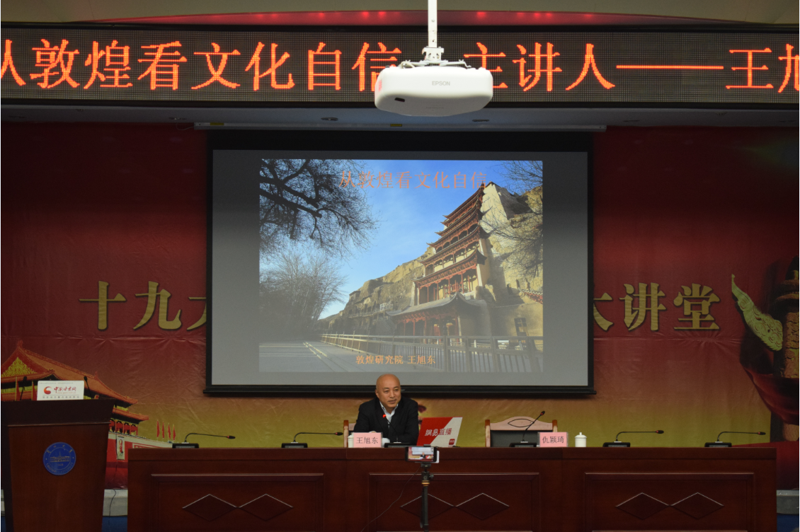 24日为“网络陇原大讲堂”的第三讲。敦煌研究院王旭东院长围绕“从敦煌看文化自信”这一主题为我们作辅导报告。王院长解析了敦煌莫高窟深厚文化的起源――敦煌莫高窟的千年营建与发展,要感恩两条“河流”的滋养:一条是在石窟前流淌的宕泉河,她为莫高窟带来了生机与绿色;另一条是敦煌本土及丝路上往来的民众们,他们世世代代的诚敬供养和不辍营建所汇聚的心灵之河,造就并延续了敦煌文化艺术。另外,王旭东还向大家介绍了敦煌石窟保护的历史与现状,并用一幅幅蕴含着悠久历史与文化底蕴的壁画,展示了敦煌这片神奇净土上的文化艺术宝库。