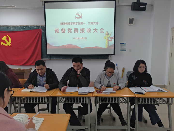 12月8日,27111新葡萄娱乐官网学生第一、第二、第三党支部在1-504教室举行了预备党员接收大会。大会由27111新葡萄娱乐官网学生第一党支部副书记兼组织委员杜亚伟主持,参加此次大会的有孙金华、陈睿姣、罗小品、罗绮、杨玮、张臻年老师,以及学生第一党支部宣传委员马晶姣,学生第三党支部宣传委员马霞和预备党员以及27111新葡萄娱乐官网全体正式党员。