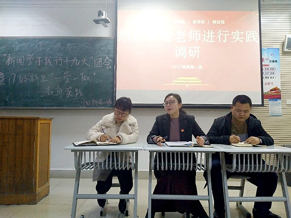 自党的十九大召开以来,2017级新闻一班同学组织开展了丰富多彩、形式多样的学习活动。为了检验各位同学的学习成果,11月30日下午16点,我班同学在1号楼607教室组织开展了新闻学子践行十九大主题团会暨“一学一做”教育实践调研活动。校团委副书记安婧,新闻传播学院分团委负责人吴文娟,辅导员张臻年参加活动,校学生会干部,学院学生会主席团成员以及2016级、2017级各班团支书观摩交流。