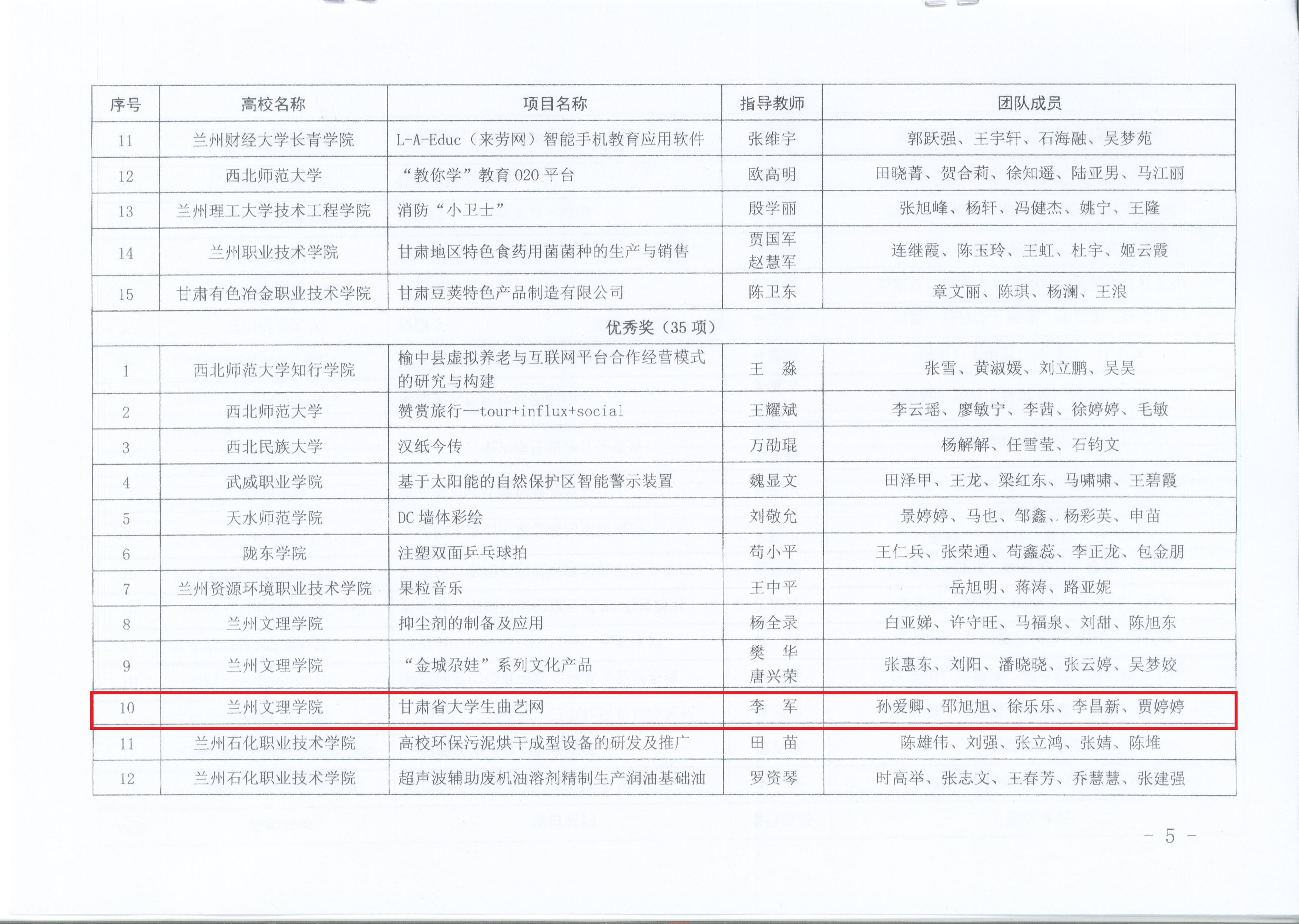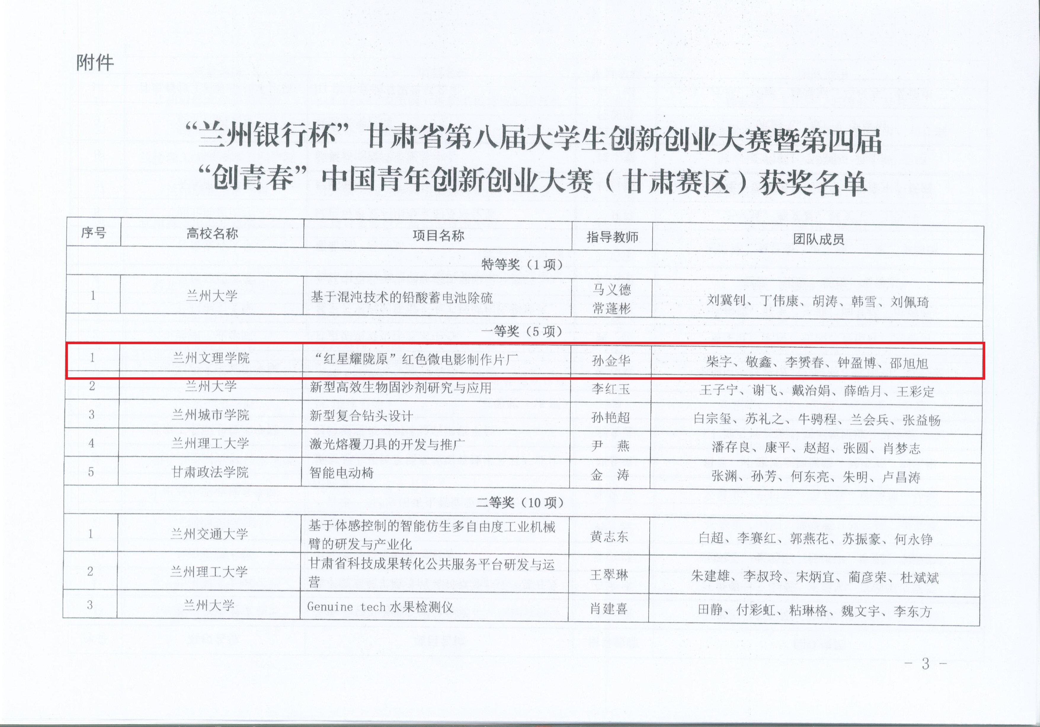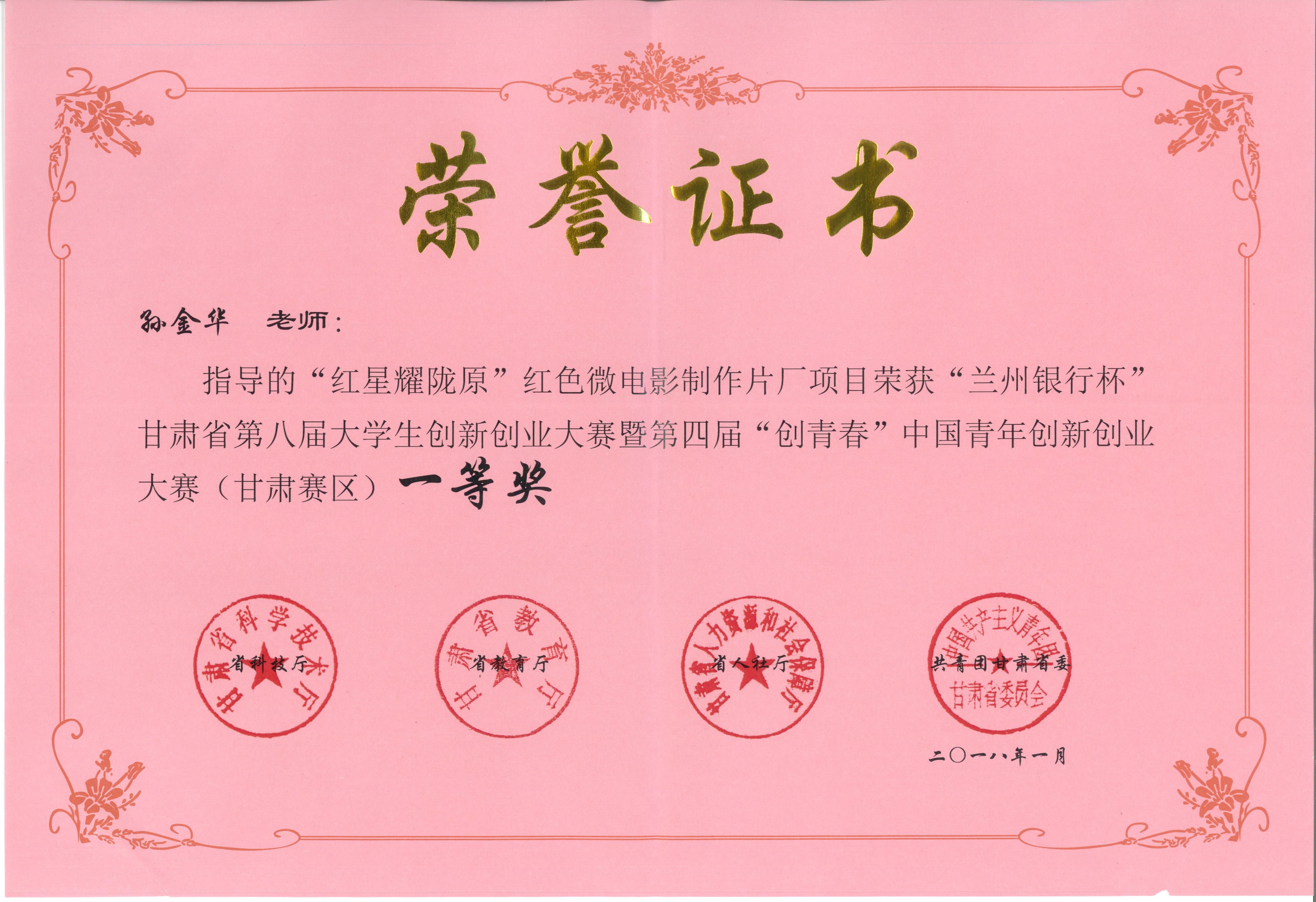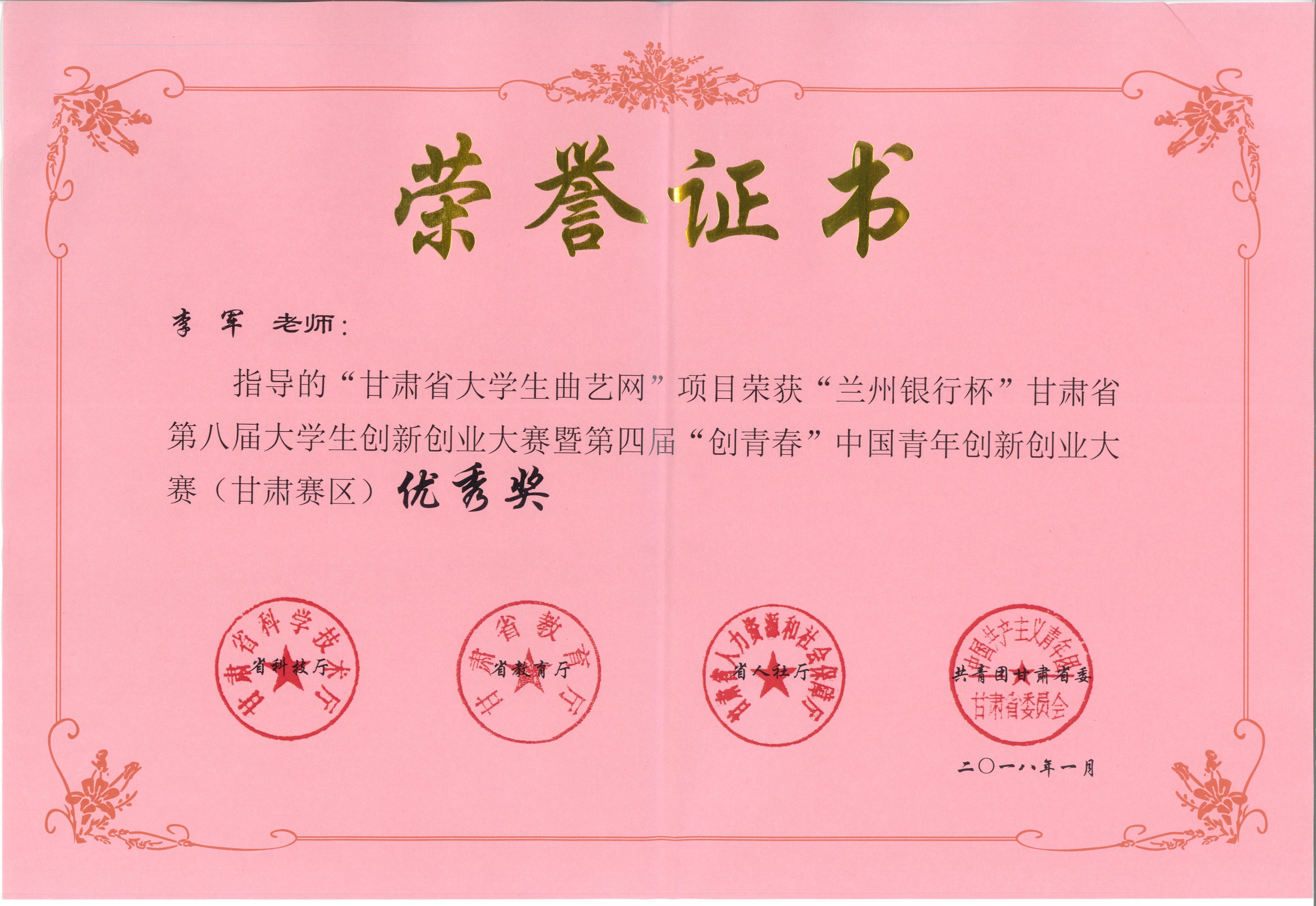近日,省科技厅、省教育厅、省人社厅、团省委联合下发文件,公布“兰州银行杯”甘肃省第八届大学生创新创业大赛暨第四届“创青春”中国青年创新创业大赛(甘肃赛区)获奖名单。我院李军副教授、孙金华老师指导的“甘肃省大学生曲艺网”项目和“红星耀陇原”红色微电影制作片厂项目分别获得优秀奖和一等奖。