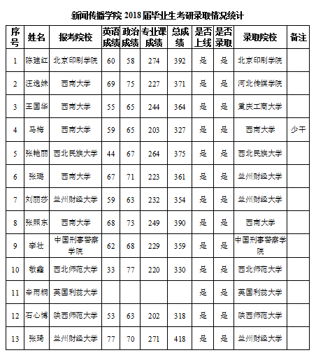 近日,2018年全国硕士研究生招生考试录取结果已经揭晓,我院考研工作喜获佳绩。全院共有62名学生参加考试,19名学生上线,13名学生被正式录取,其中有5名学生被西南大学、陕西师范大学、英国利兹大学、中国刑事警察学院等知名高校录取,录取人数占报考人数比例为20.97%。