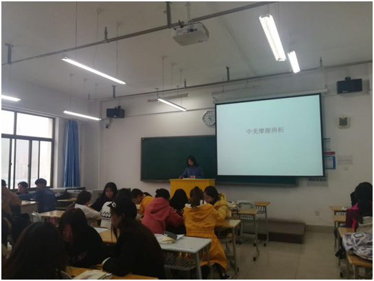 首先,班长付娟就中美摩擦进展情况,美国在贸易战中的霸权行为,和这场贸易摩擦对我国的影响等几个方面进行了阐述。其次,她讲到中美摩擦中我们应当用理想的态度对待。最后,付娟希望同学们能更加深入地了解中美贸易摩擦的原因,能够正确的了解中美关系。同时增强对中国解决贸易摩擦问题的信心。