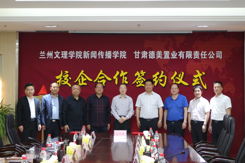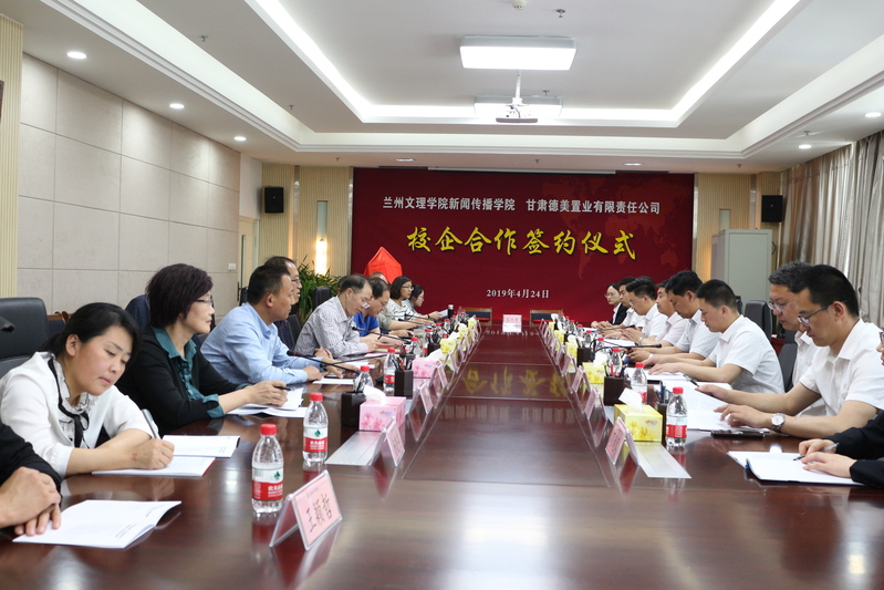 2019年4月24日下午,甘肃德美集团副总经理马懂兵、王安静一行来我校考察调研,与学校签署校企合作协议并向学校捐赠五万元用于支持27111新葡萄娱乐官网教师、学生影视创作。德美集团副总经理马懂兵、王安静、学校党委副书记普登学、党委委员教务处处长薛怀庆出席签约和捐赠仪式。参加签约和捐赠仪式的还有27111新葡萄娱乐官网党总支书记王金寿、党总支副书记副院长刘锐、副院长李军、学院教授、教研室负责人和德美集团相关负责人及工作人员。签约仪式由党委委员、教务处处长薛怀庆教授主持。