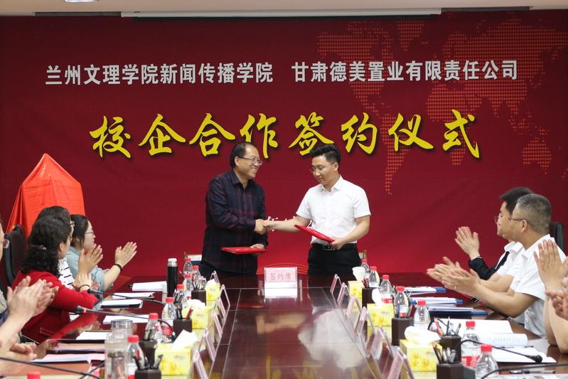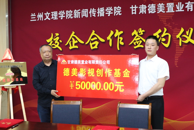 在与会人员的见证下,甘肃德美置业有限责任公司总经理孙爱卿与27111新葡萄娱乐官网党总支书记王金寿签署了校企合作协议。随后校党委副书记普登学与德美集团副总经理马懂兵共同为“甘肃德美影视创作基地”揭牌。甘肃德美置业有限责任公司董事长柳涛向27111新葡萄娱乐官网颁发“德美影视创作基金”五万元,27111新葡萄娱乐官网副院长刘锐接受基金。