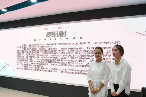 答辩会上,来自2016级播音主持班的学生向在座教师展示了广播单本剧《蓝色的敦煌》及纪录片《美食大侦探》,并介绍了本次毕业设计作品的创作背景、设计思路、指导记录、创作历程、节目亮点、目的和意义以及对作品的反思。