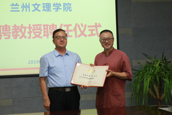 随后人事处副处长卢志辉宣读学校特聘教授聘任决定并由校长张伟强为周兵导演颁发聘书。