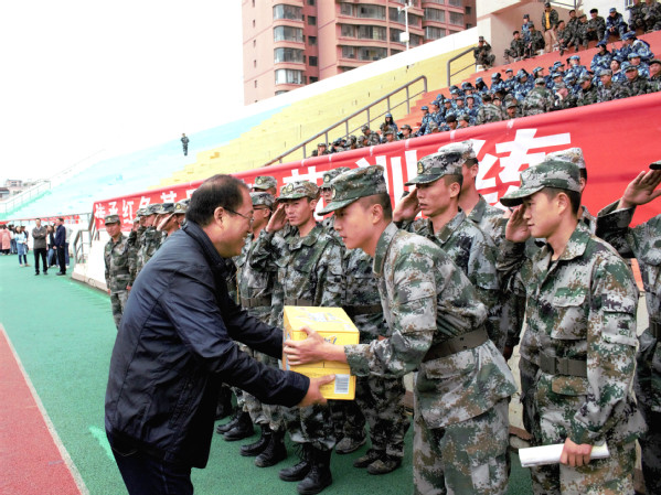 党总支书记王金寿对2019级新生的到来表示诚挚的欢迎,他提出,军训是同学们踏入大学后的第一课,同学们要认真对待,严格要求,刻苦训练,以培养艰苦奋斗,吃苦耐劳的精神,养成良好的生活习惯,为随后的学习和生活奠定良好的基础。他强调,同学们要端正态度,充分认识到军训对于自身的意义。此外,同学们在军训期间要有组织纪律性,做到一切行动听指挥,全体同学要克服困难,努力迎接挑战,并预祝同学们圆满完成军训任务。 最后,王金寿向承训教官致以谢意,并赠送了慰问品。