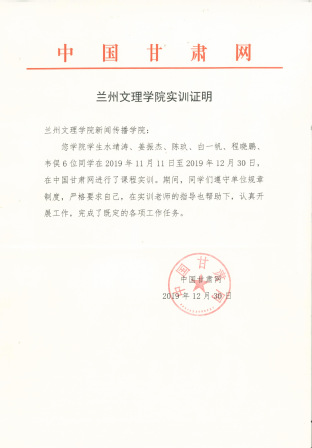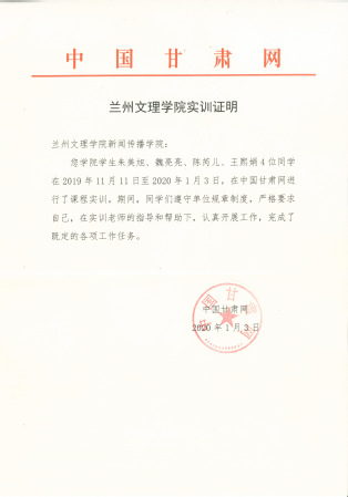2019年11月11日我院选派朱美旭、陈芮儿、魏亮亮、韦俣、姜振杰、王熙娟、陈玖、程晓鹏、水靖涛、白一帆于中国甘肃网专业实训至2020年1月3日。学生全面拓宽了知识面,增加了实践能力,显著提升了学习兴趣、专业技能和创新能力等综合素质。学生普遍反馈“去中国甘肃网实习基地实习是一个机会难得的经历,实训期间受到中国甘肃网各位老师的悉心指导,实训效果显著,不仅锻炼了独立思考的能力、动手能力,同时还激发了创新潜能”。