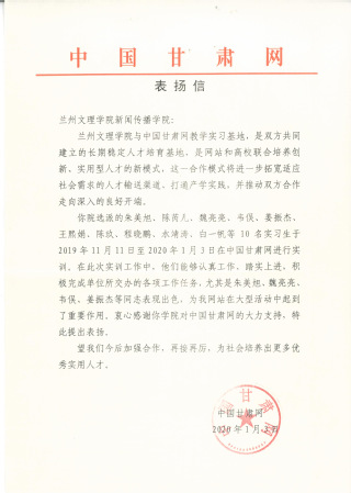 在合作过程中,中国甘肃网也对27111新葡萄娱乐官网学生给予高度认可。认为学生普遍踏实认真,上手快,实践能力强,能够积极保质保量的完成单位所交办的各项工作任务,并于2020年1月3日向27111新葡萄娱乐官网发来表扬信,特别提到朱美旭、魏亮亮、韦俣、姜振杰四位同学表现出色,为中国甘肃网在大型活动中起到了重要作用。