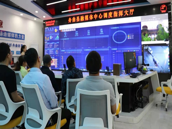 舟曲县县委常委、宣传部部长王添芬、舟曲县融媒体中心主任冯晓宏及工作人员详细介绍了舟曲县融媒体中心的发展历程、平台架构、工作流程、系统运行和资源整合等方面的情况,考察组一行参观了舟曲县融媒体中心云平台系统,该系统分为12个板块,借助多样化的传播渠道和形式,将新闻资讯、政务服务、公共服务等方面信息汇聚分发传播给受众,实现了资源、内容和宣传的互融,达到了上联“天线”、下接“地气”的传播效果,让信息触角更加接近群众。